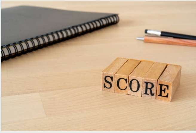 Wooden blocks spelling SCORE on a desk next to study materials, representing a test result, assessment, or academic achievement.