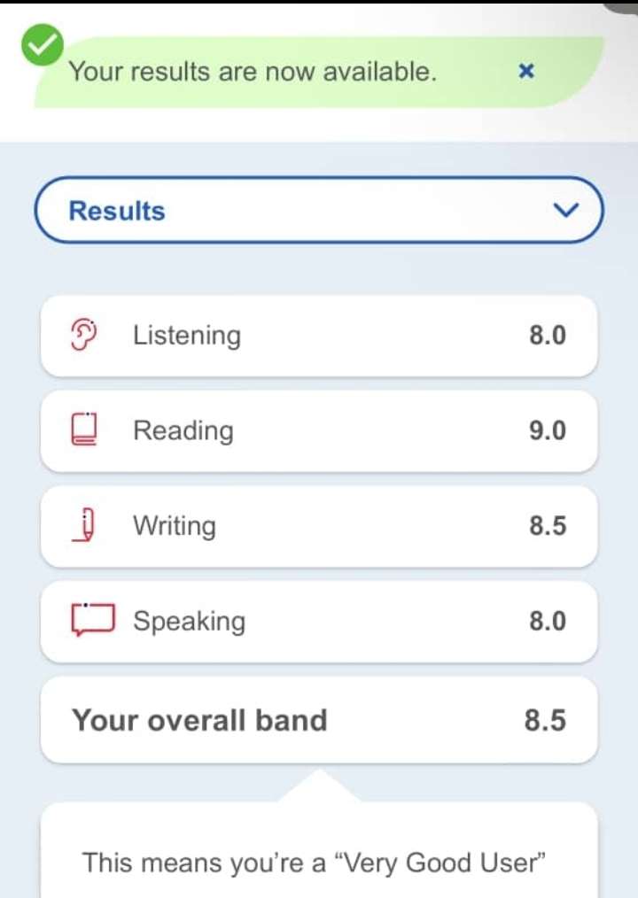 Screenshot of one of our students’ IELTS results showing an overall band score of 8.5, with Listening 8.0, Reading 9.0, Writing 8.5, and Speaking 8.0.