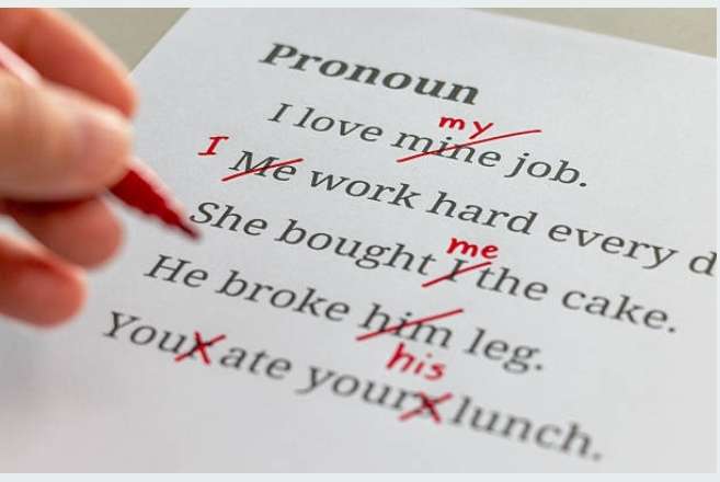 A document marked with a red pen correcting pronoun errors in sentences like “I love mine job” and “Me work hard every day.